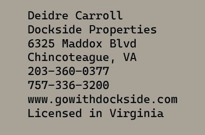 Chincoteague was my family's favorite vacation destination. My Mother was actually born here but was raised in Connecticut. The opportunity became available to move here permanently with my mother in 2014. I began working for Dockside Properties in 2015. I love meeting new clients and assisting them in buying or selling and taking that next step in their journey. I find the entire process is very exciting! From witnessing clients find that property that they must have, to helping clients with staging and displaying their properties to really showcase its beauty!As well as, helping buyers see the potential in diamonds in the rough, with a little love, work and attention. The connection I have had with my clients has been extremely enjoyable.